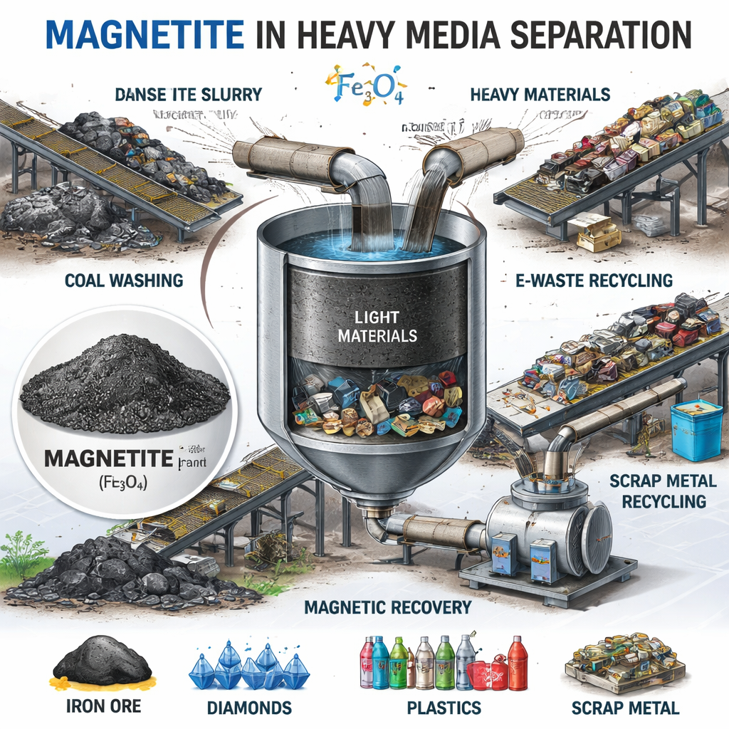 Magnetite powder is mixed with water to form a dense slurry used to separate materials by density.